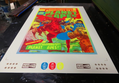 Blunt Graffix – Adventures on the Planet of the ApesAVAILABLE NOW! Alan Forbes Benefit: http://www.secretserpentsstore.com/servlet/the-1018/Planet-of-the-Apes/Detail Red Horse 24×36″ 4 color handpulled screenprint Blacklight Responsive edition of 40 Blunt Graffix Cover Details: Adventures on the Planet of the Apes Vol 1… December 3, 2013