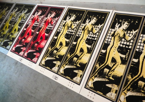 The Space Invaders print is a 4 color, hand pulled screenprint with Florescent Blacklight Inks, metallics and the blue glows in the dark! The dimensions are 10×20″ and its printed on 100lb cougar…